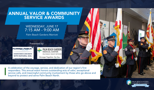 Join the Palm Beach North Chamber of Commerce for our 'Business Before Hours: Annual Valor Awards' on Wednesday, June 17, 2026, to celebrate our region's first responders and all their hard work and dedication to keeping our communities safe beyond the call of duty.