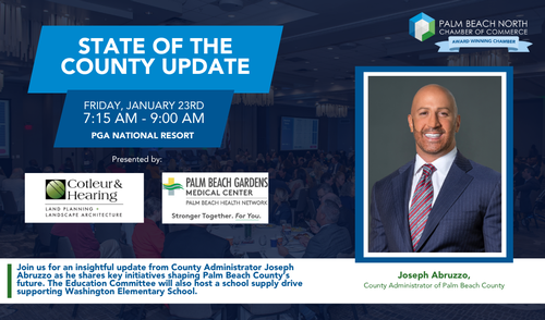 Join the Palm Beach North Chamber of Commerce on Friday, January 23, 2026 for 'Business Before Hours: State of Palm Beach County Update featuring Palm Beach County Administrator Joseph Abruzzo. This discussion will address the most pressing issues and developments within Palm Beach County, offering valuable insights into current priorities, future plans, and strategic initiatives shaping our region’s growth and prosperity. Engage with Administrator Abruzzo as he shares his perspective, answers questions, and explores solutions to enhance the quality of life for residents and businesses across our county.