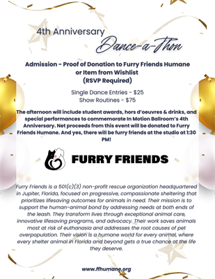 In Motion Ballroom is proud to announce its 4th Anniversary Celebration and Dance-A-Thon Fundraiser, a special evening dedicated to celebrating four incredible years of dance, community, and connection—while giving back to a cause close to our hearts.